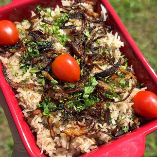 The first dish she served was mujaddara, a Middle Eastern classic. Mujaddara is a simple, yet incredibly satisfying, combination of rice and lentils, usually topped with caramelized onions. The lentils were tender, perfectly cooked, and seasoned with just the right amount of flavor. The rice was light and fluffy, providing the perfect base for the earthy lentils. But it was the caramelized onions that really elevated this dish. They were sweet, golden, and rich, adding a beautiful contrast to the savory flavors of the lentils and rice. The dish was so comforting, yet so full of character, with every bite telling a story of tradition and love.